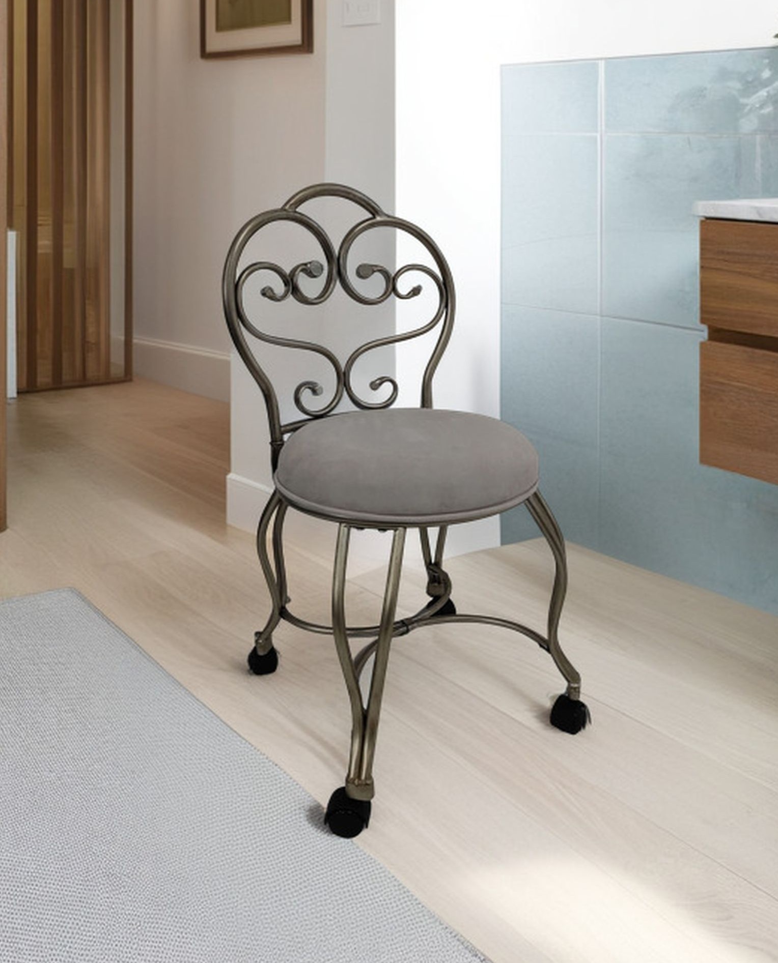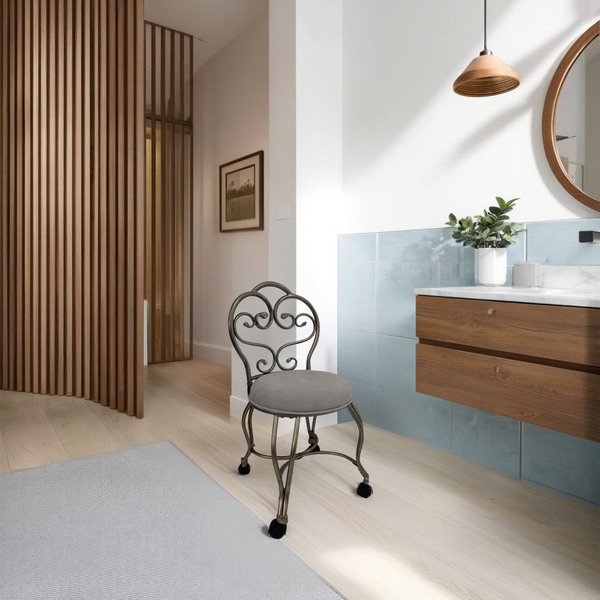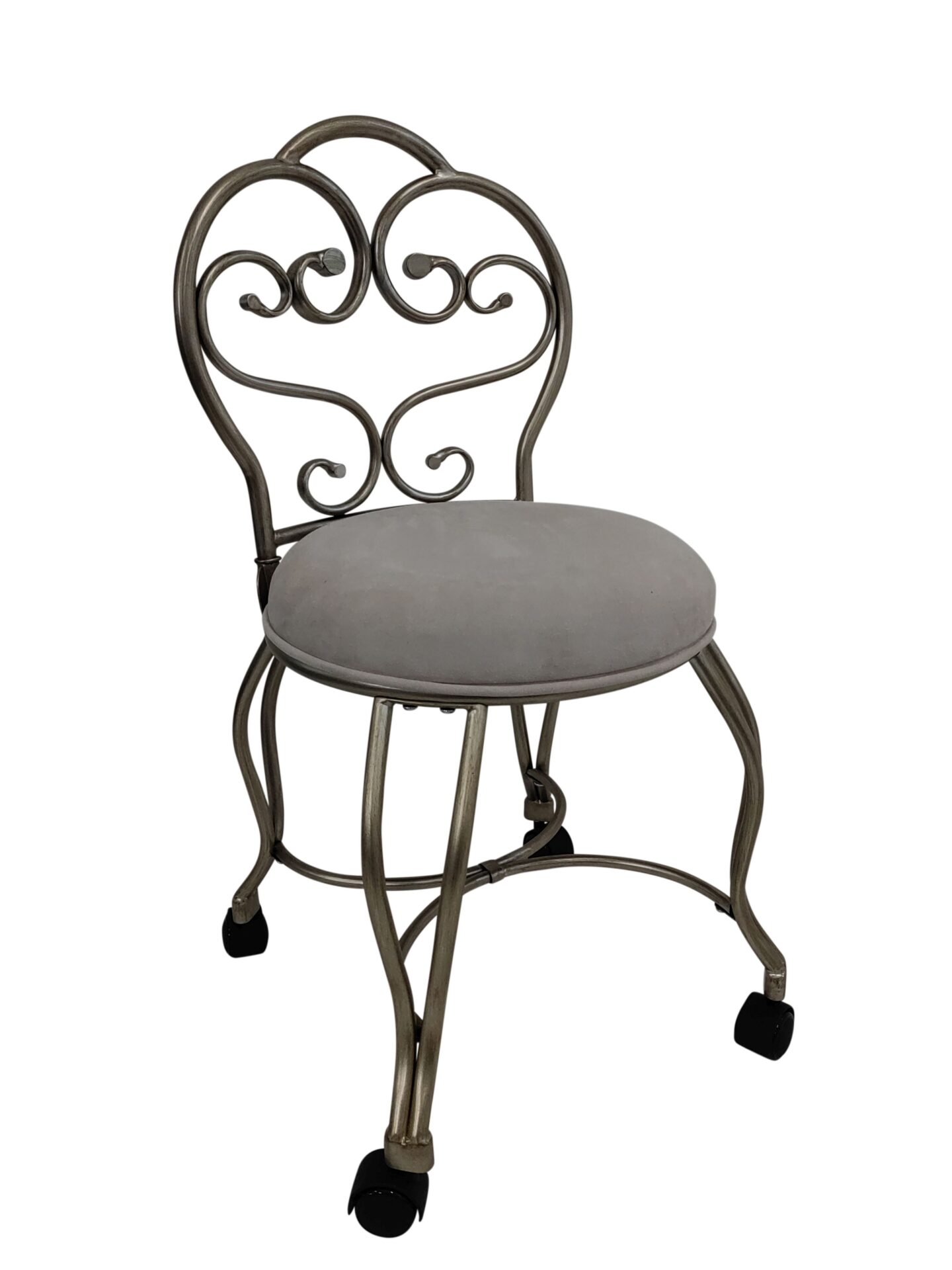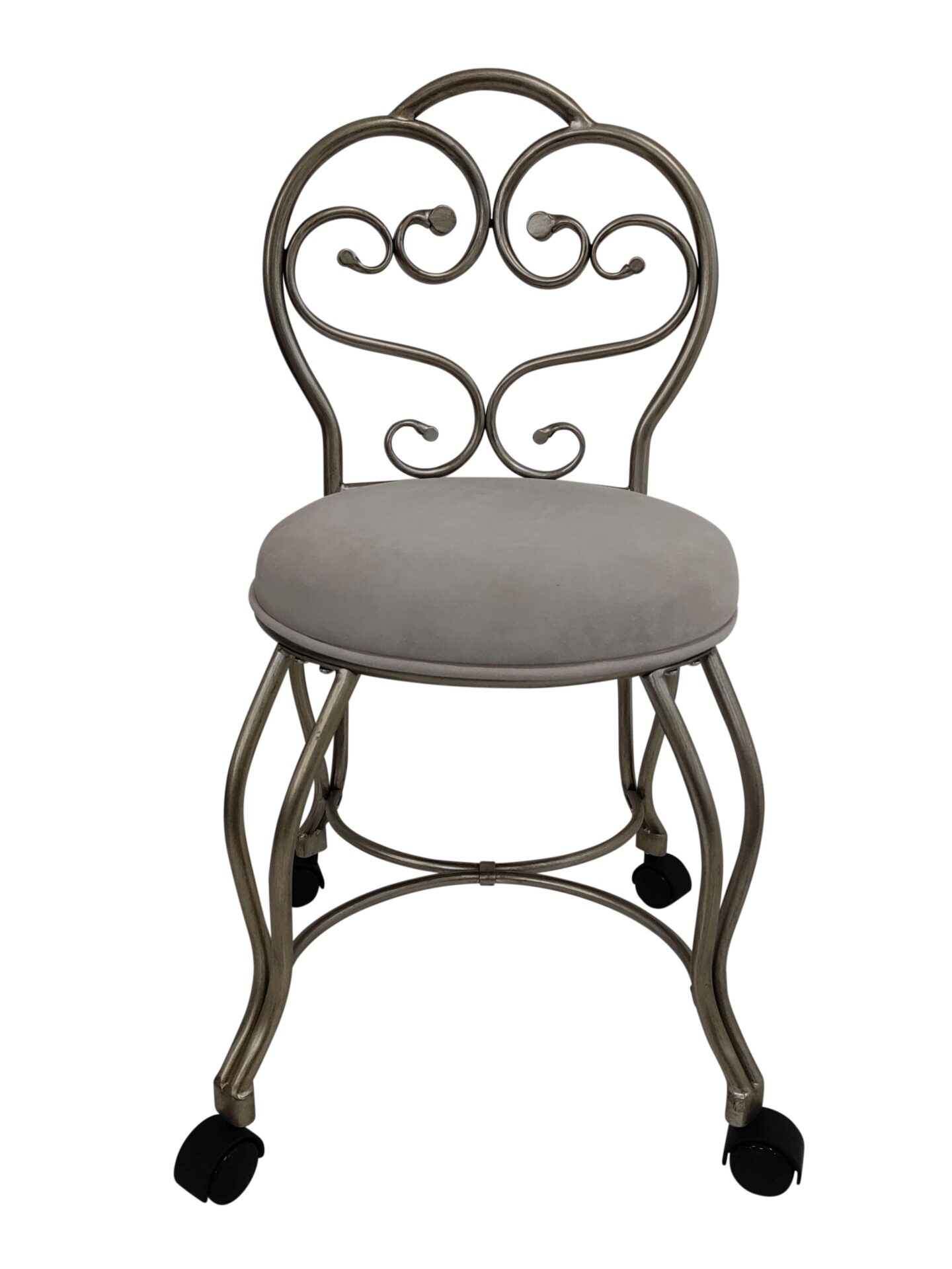 Indulge in timeless elegance with this Victorian Vanity Stool, a perfect blend of classic beauty and modern convenience. Adorned with delicate scroll-work and a golden finish, glimmers softly, evoking the opulence of a bygone era. Topped with a plush cushion in a soft, muted tone, it invites luxurious comfort. Smooth-rolling casters ensure effortless mobility, making it an ideal addition to your dressing room or as a charming accent piece. Experience the romance of Victorian design with this exquisite stool, where every moment spent is a step into a world of beauty and sophistication.